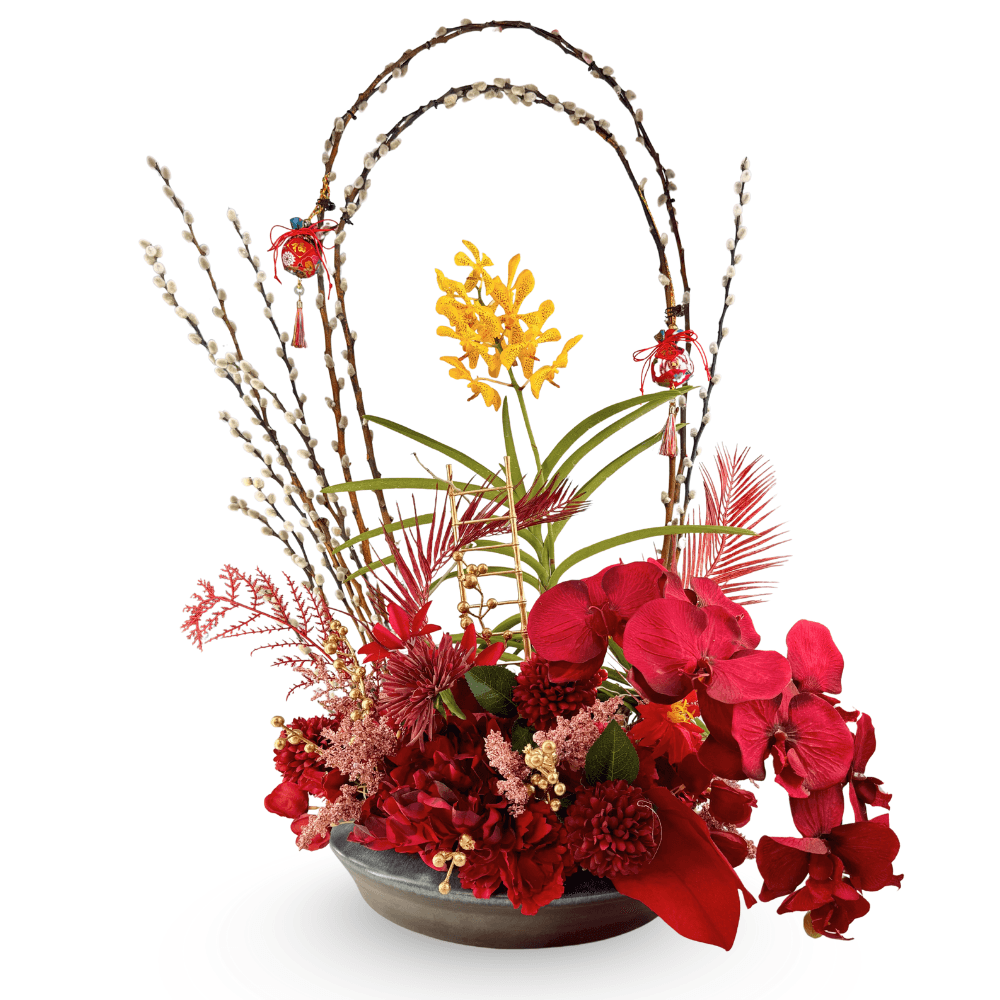 Curved pussy willow branches form an elegant arch, symbolising continuity, renewal, and the steady rise of good fortune. Accented with auspicious red and gold Chinese New Year décor, the arrangement blends tradition with contemporary floral artistry — where golden hues represent wealth and success, while red signifies joy, protection, and celebration.
