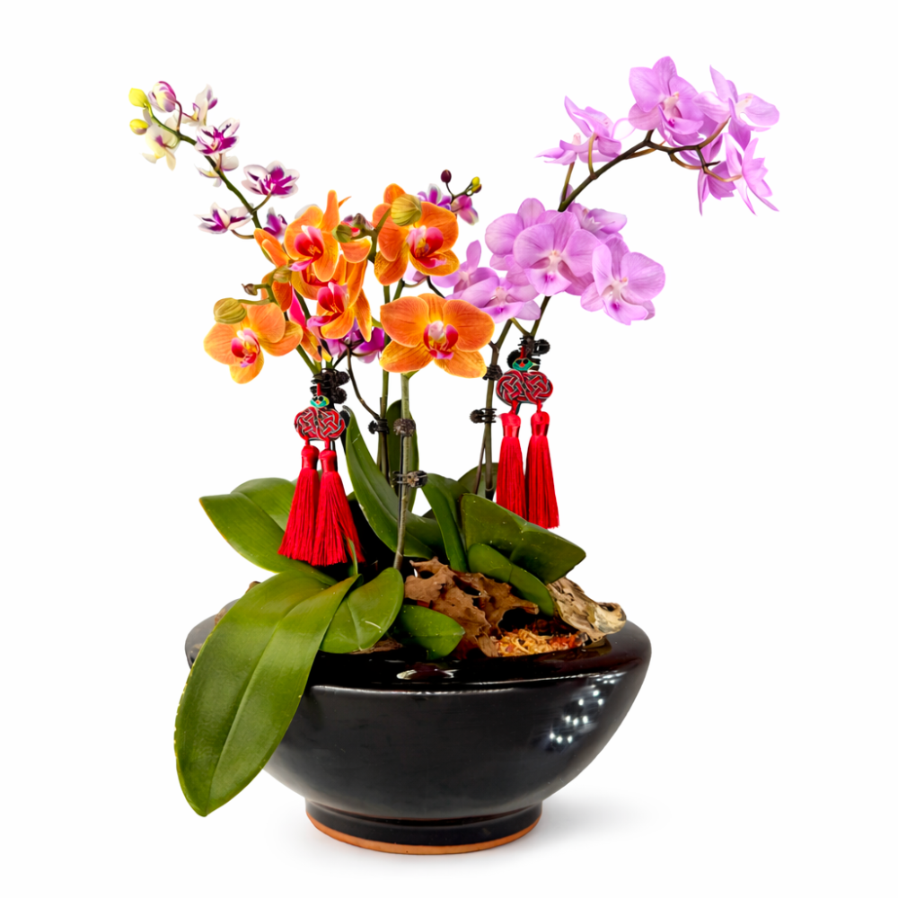 Phalaenopsis Arrangement | Triple Blessings is a vibrant and uplifting composition that celebrates abundance, harmony, and joy. Featuring three graceful Phalaenopsis orchids in complementary hues, this arrangement symbolises triple blessings—often associated with fortune, longevity, and happiness. Accented with festive tassel ornaments, it blends traditional auspicious elements with a clean, contemporary presentation. Set in a sleek, low-profile ceramic pot, Triple Blessings is perfect for tabletops, coffee tables, or reception counters, bringing a cheerful yet refined touch to Chinese New Year celebrations or everyday gifting.
