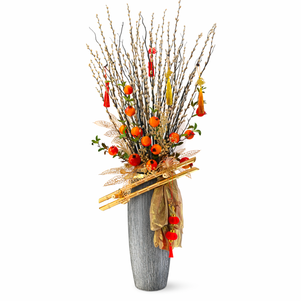 A modern Chinese New Year statement piece designed to symbolise renewal, prosperity, and a fresh beginning. Golden New Dawn features elegant pussy willow branches accented with auspicious festive elements, arranged in a refined contemporary style that suits both residential and commercial spaces.