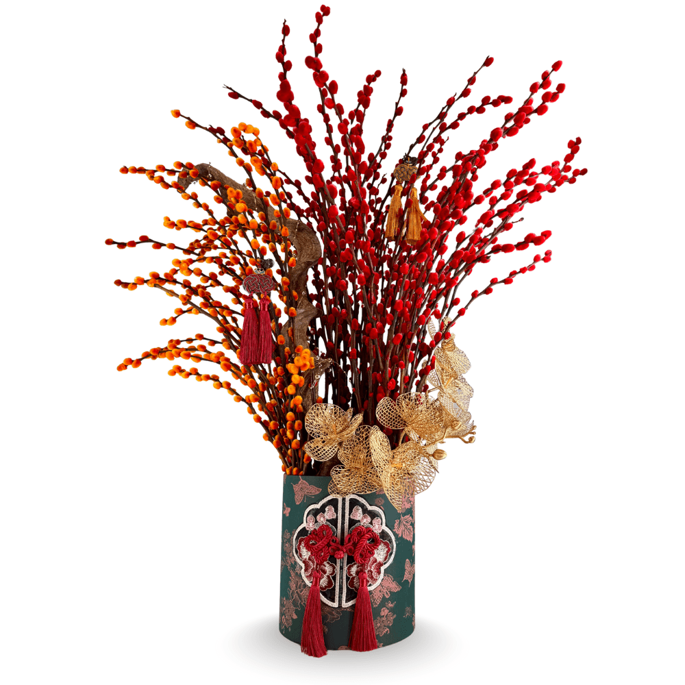 Pussy Willow Arrangement |Â Harvest of Abundance is a grand and expressive festive arrangement, designed to reflect overflowing prosperity and joyful celebration. Featuring an abundant display of vibrant red pussy willow branches accented with golden highlights, this piece represents plentiful blessings, good fortune, and thriving opportunities. Presented in a striking decorative vessel and finished with auspicious embellishments, it commands attention as a centrepiece for festive settings. Ideal for Chinese New Year displays or premium gifting, Harvest of Abundance embodies prosperity at its fullest and most celebratory form.