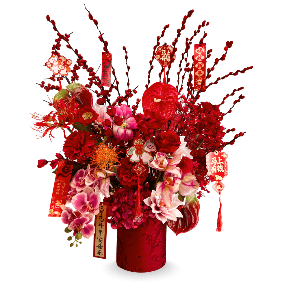 A lavish Chinese New Year statement piece featuring vibrant red pussy willow branches paired with an abundance of festive blooms and auspicious CNY ornaments. Accented with traditional charms symbolising wealth, luck, and prosperity, this arrangement radiates celebration and abundance from every angle.