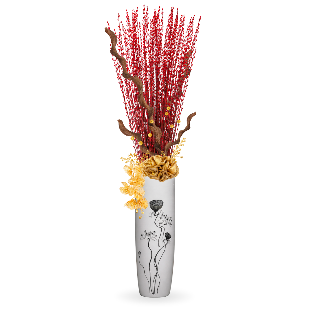 Red Meridian is a striking, sculptural pussy willow arrangement designed to command attention with its strong vertical form and rich red tones. Rising gracefully from a refined statement vase, the arrangement symbolises growth, prosperity, and forward momentum, making it an ideal centrepiece for entrances, living spaces, or corporate settings. Accented with sculptural curled wood and subtle gold elements, it balances natural texture with modern elegance, creating a timeless display that remains impactful beyond festive seasons while requiring no maintenance.
