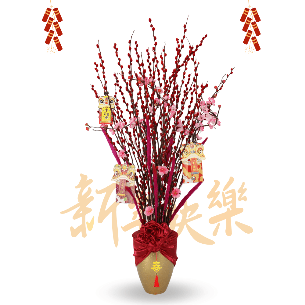 Delicately accented with pink sakura blossoms, auspicious dragon red packets, and festive hanging ornaments, each element is thoughtfully chosen to convey good fortune, protection, and celebration. The vibrant red tones are further enhanced by a handmade red cloth ribbon, symbolizing happiness, unity, and enduring luck. Presented in a classic CNY gold pot, the arrangement exudes festive grandeur and elegance.